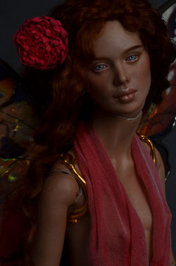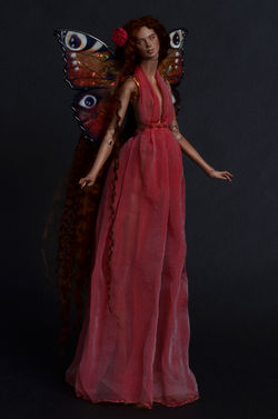 The clothes are made of natural silk, embroidered with hematite beads.Wings are removable, made from mother of pearl, and painted with oil paints in technic of lacquer miniature, framed in Rhodium plated silver.