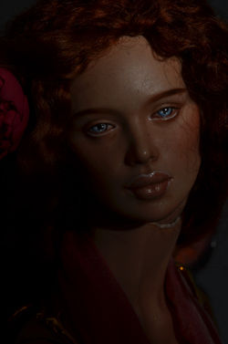 OOAK porcelain doll, 37 cm tall. Drawn with overglaze china paints and assembled on stainless steel springs. The joints are glued by leather. Wig made of alpaca and embroidered with carved mother-of-pearl flowers.