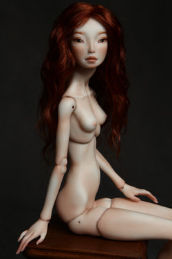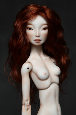Maiumy, 30cm, made of porcelain, drawn with overglaze china paints and assembled on elastic band. A removable wigs has a silicone base, the joints are glued by leather and Decola.