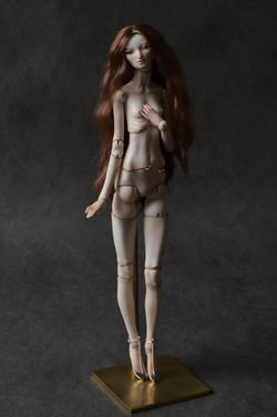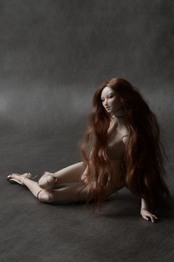 Naiad, OOAK, porcelain BJD doll. 36cm. tall, drawn with overglaze china paints and assembled on stainless steel springs. A wig made from mohair. The joints are lined by leather.