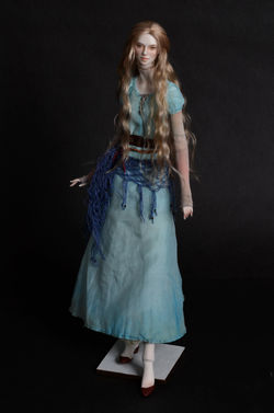 OOAK porcelain doll, 36 cm tall. Drawn with overglaze china paints and assembled on stainless steel springs. The joints are glued by leather. Wig made of genuine mohair.