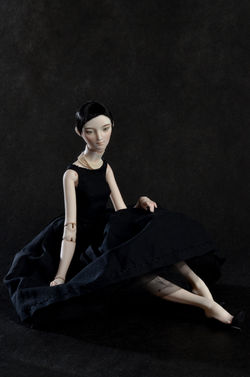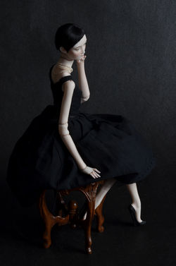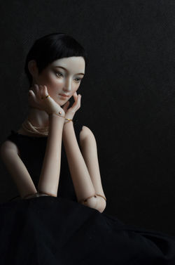 Vivien, porcelain BJD doll. 37cm. tall, drawn with overglaze china paints and assembled on stainless steel springs. A wig made of alpaka. The joints are lined by leather. The dress is made of silk, embroidered with beads. Doll have 24k gold applique on her hands. Shoes are from polyurethane.